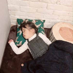 お写真のお子様、姉妹でキッズルームでキャッキャと遊ぶ声が急に静かになったと思ったら…!寝てる…!ぐずることもなくお昼タイム😌